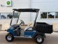 Ex-Hire, 48 Volt electric utility buggy, blue body panels, treaded tyres, head lights, roof and flip windscreen.